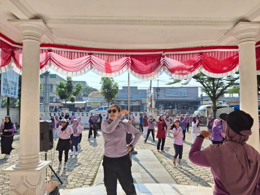 Senam dipandu langsung oleh Miss Tri Zuko, instruktur senam yang energik dan berpengalaman. Suasana pagi itu terasa meriah dan penuh tawa, diiringi musik ceria yang membuat peserta semakin bersemangat mengikuti setiap gerakan.